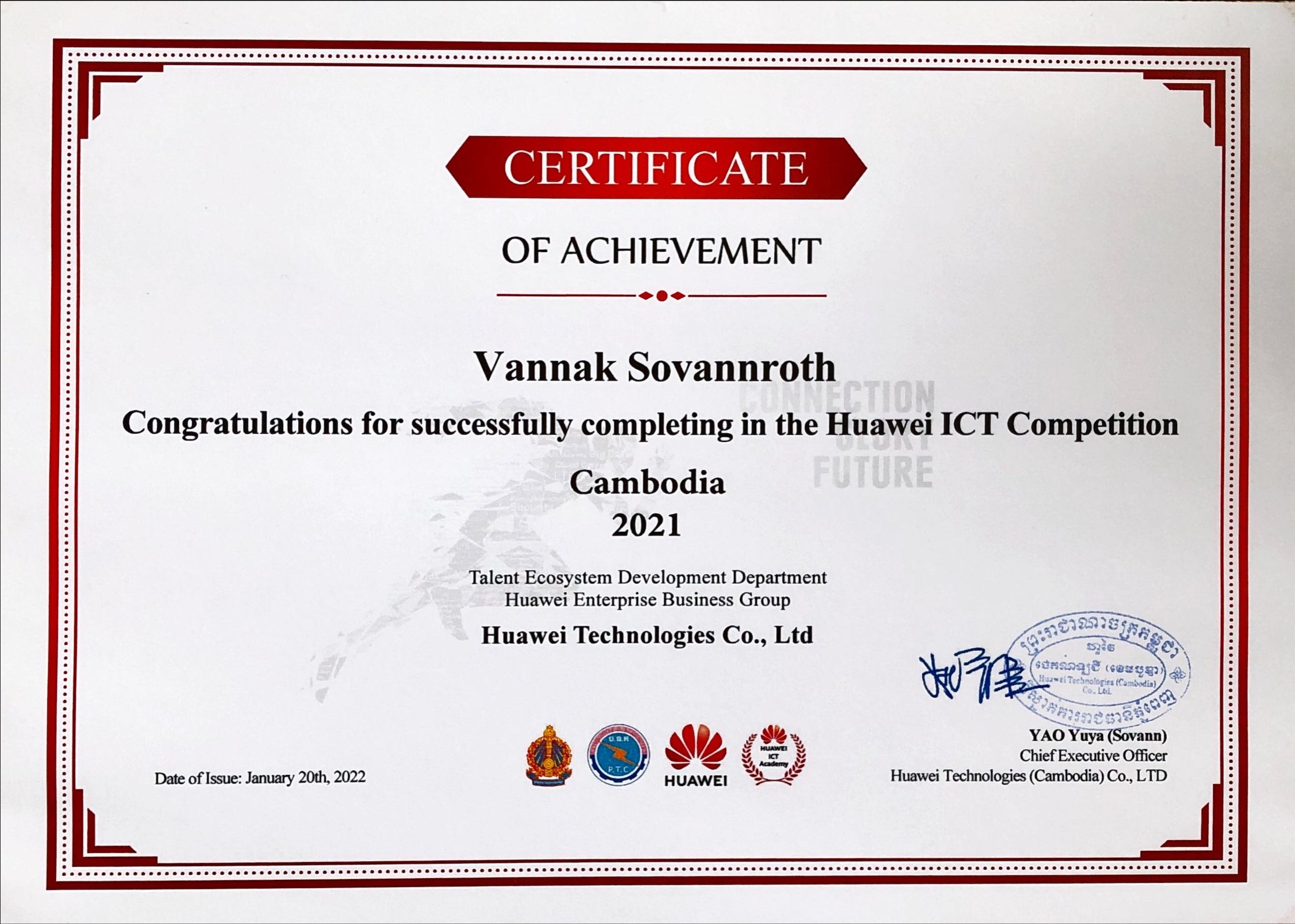 The Certificate has participated in the final round of competition Huawei ICT Cambodia 2021